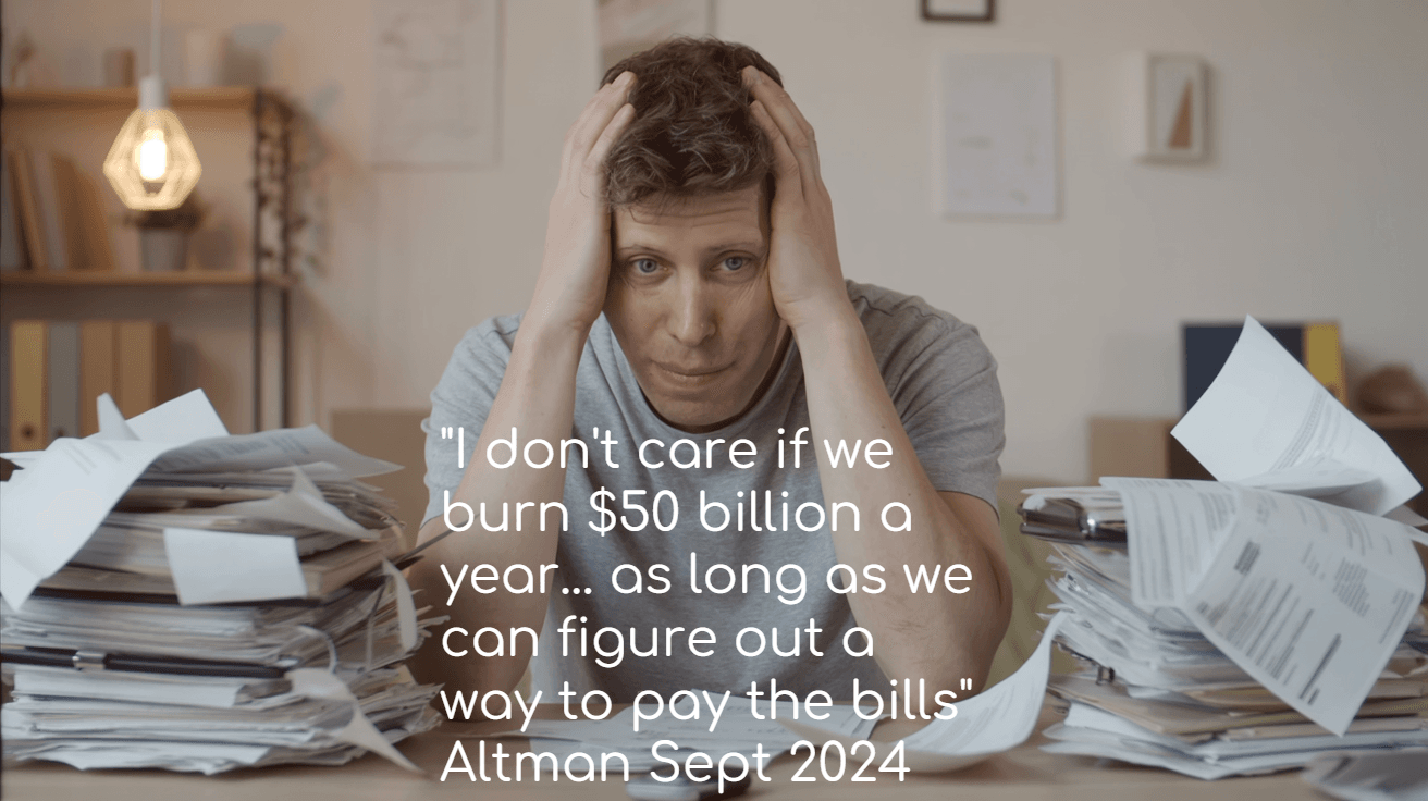 "Whether we burn $500 million, $5 billion, or $50 billion a year, I don't care. I genuinely don't, as long as we can stay on a trajectory where eventually we create way more value for society than that and as long as we can figure out a way to pay the bills" (Altman, 2024, emphasis added).